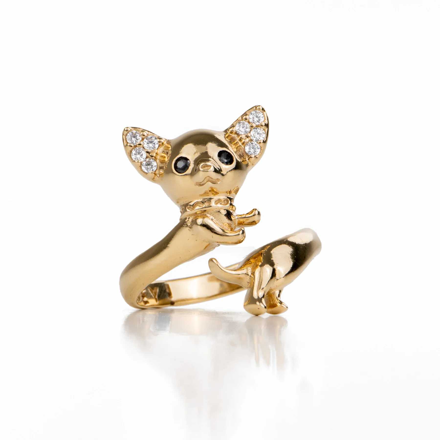 Hermoso anillo de plata con dije en forma de perrito chihuahua con un baño de color Oro Amarillo. Se adapta al dedo gracias a su diseño abierto.