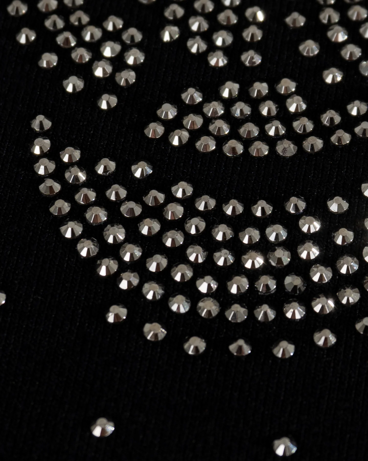 Esta blusa negra para mujer presenta un corte asimétrico de hombro caído y una ilustración de jaguar en pedrería fina. El diseño combina el brillo de los cristales con una silueta moderna, logrando una prenda de inspiración felina para eventos nocturnos.