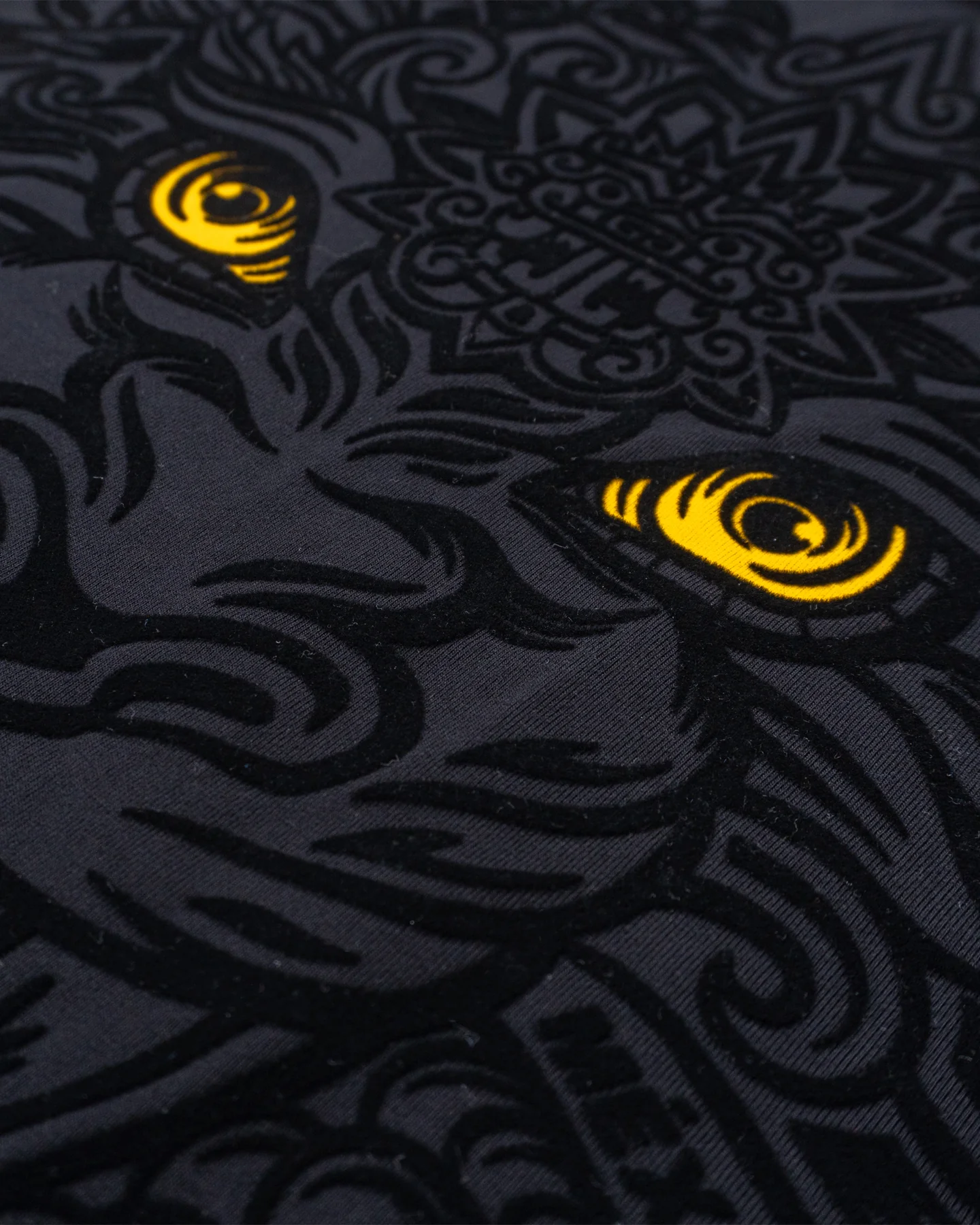 Inspirada en la fuerza ancestral de los guerreros jaguar del México prehispánico, esta playera representa el poder oculto que todos llevamos dentro. El diseño en negro sobre negro genera un efecto visual sobrio y elegante, que solo revela sus detalles al acercarse, como un secreto que espera ser descubierto.