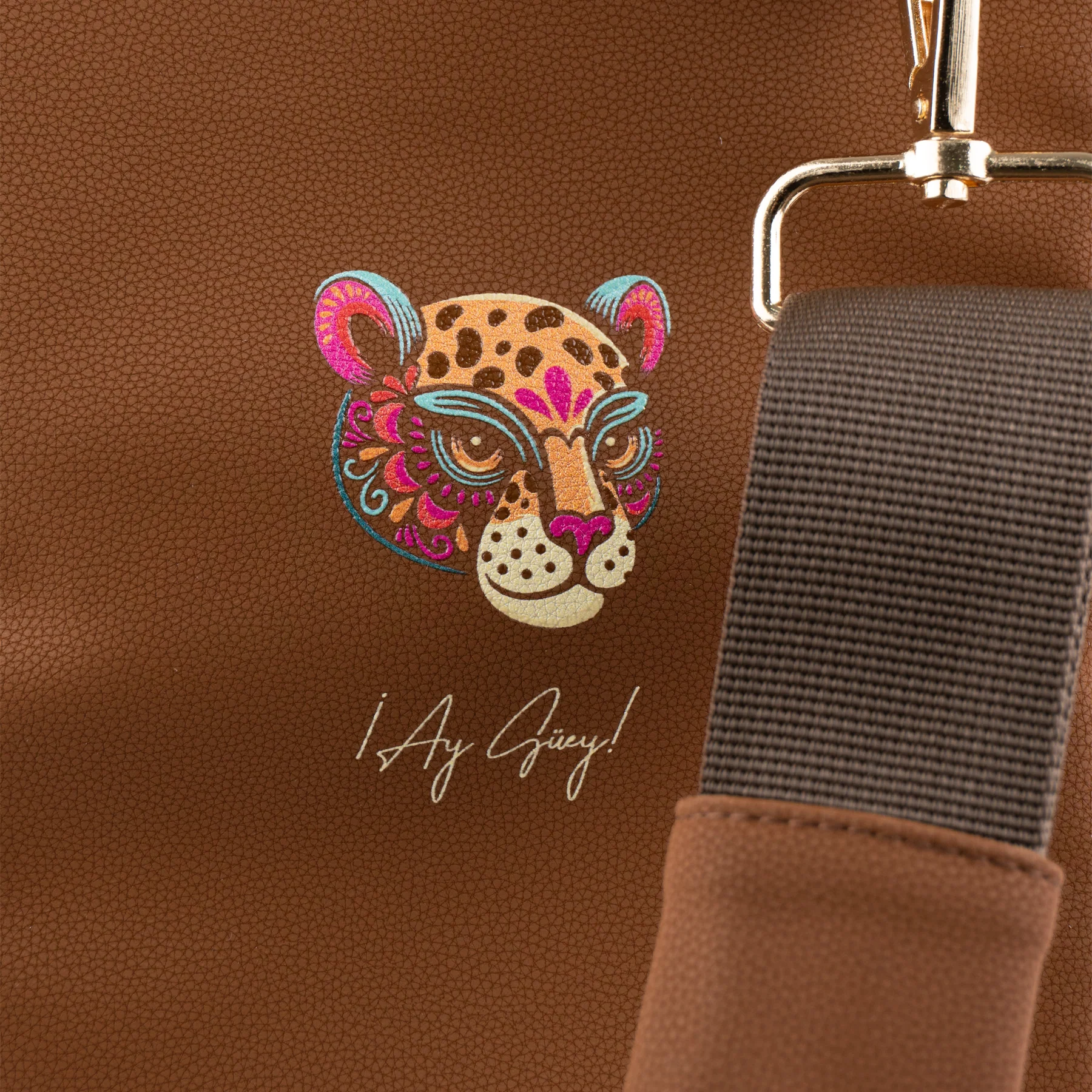 Mochila tipo bandolera, con correa de de tela, inspirada en el jaguar y las flores primaverales.