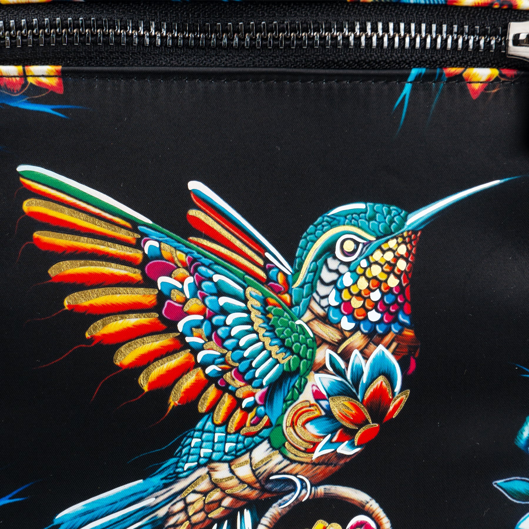 Mochila tipo bandolera, con correa de tela, inspirada en el colibrí y la primavera.