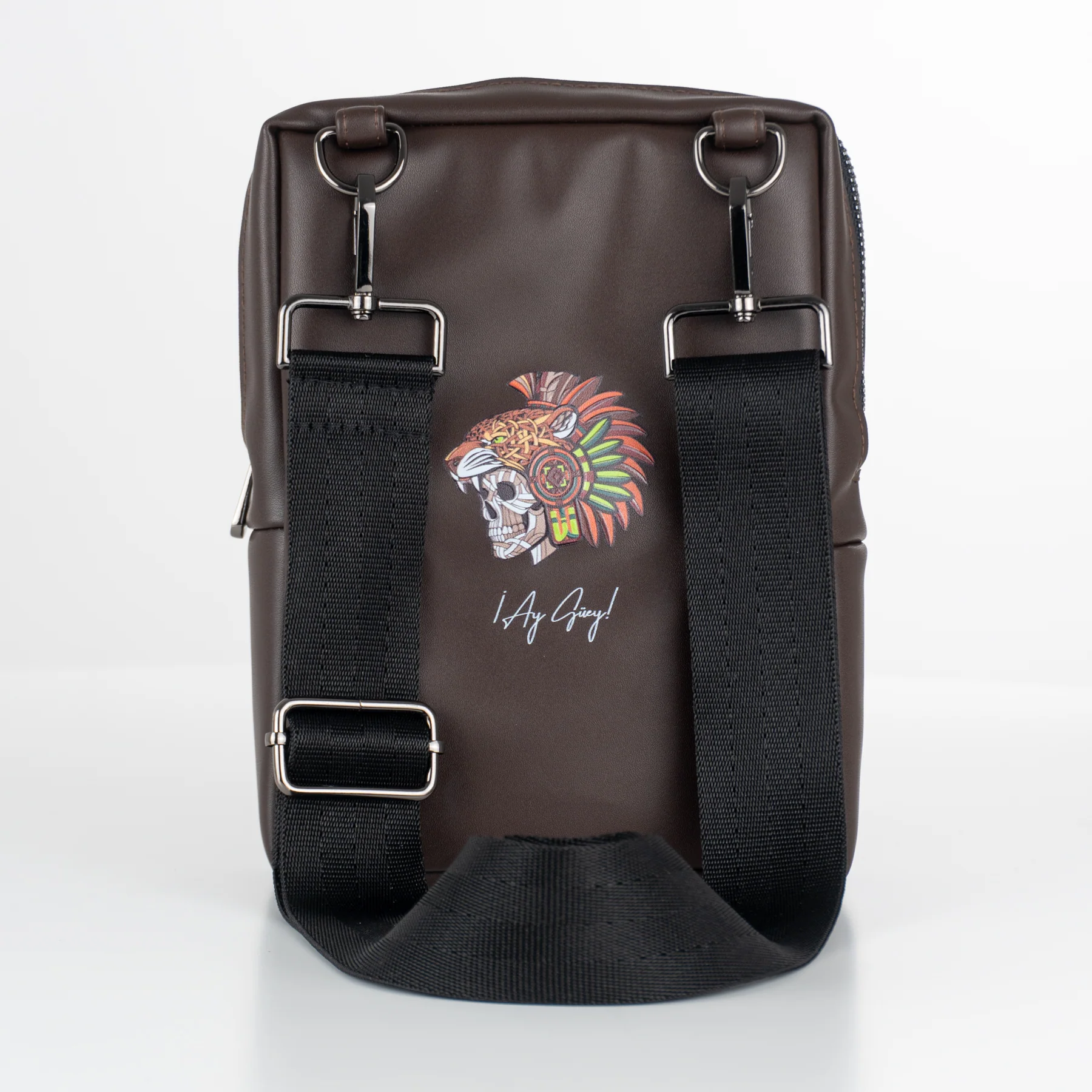 Mochila tipo bandolera, con correa de de tela, inspirada en el gerrero jaguar y las artesanías tejidas. Cuenta con aplicaciones de foil metalizado y flock, que le aporta textura de terciopelo a diversas áreas del diseño.