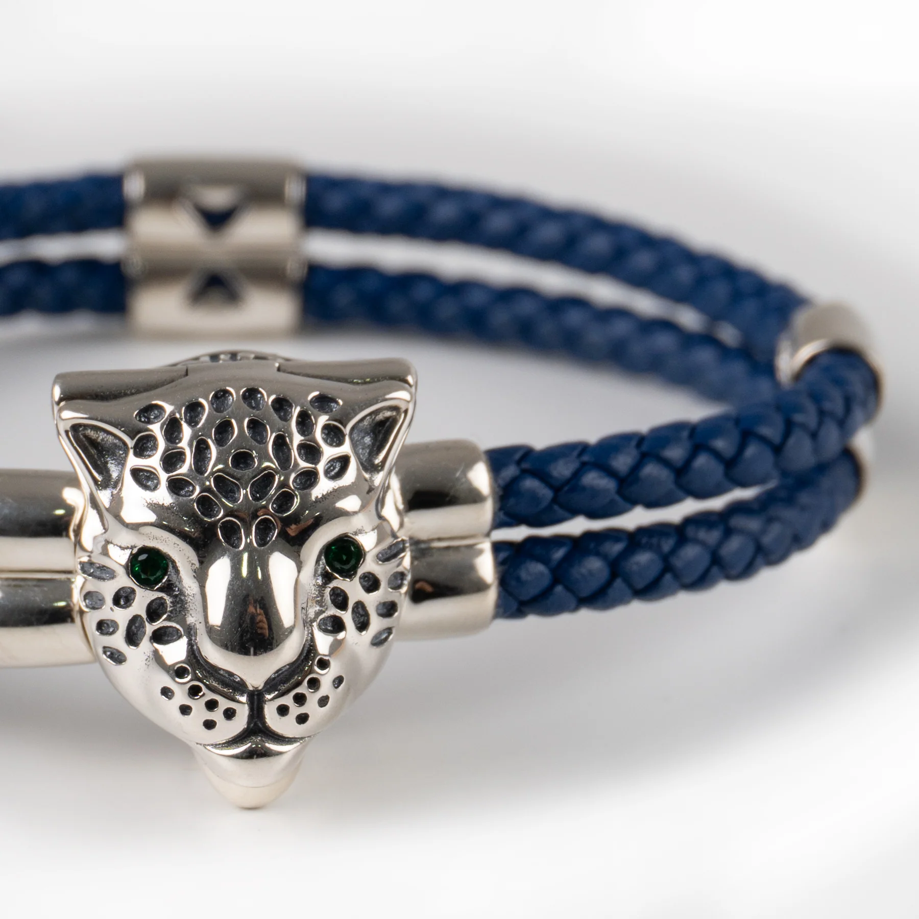 Brazalete Piel Trenzada Azul con dije Jaguar de plata