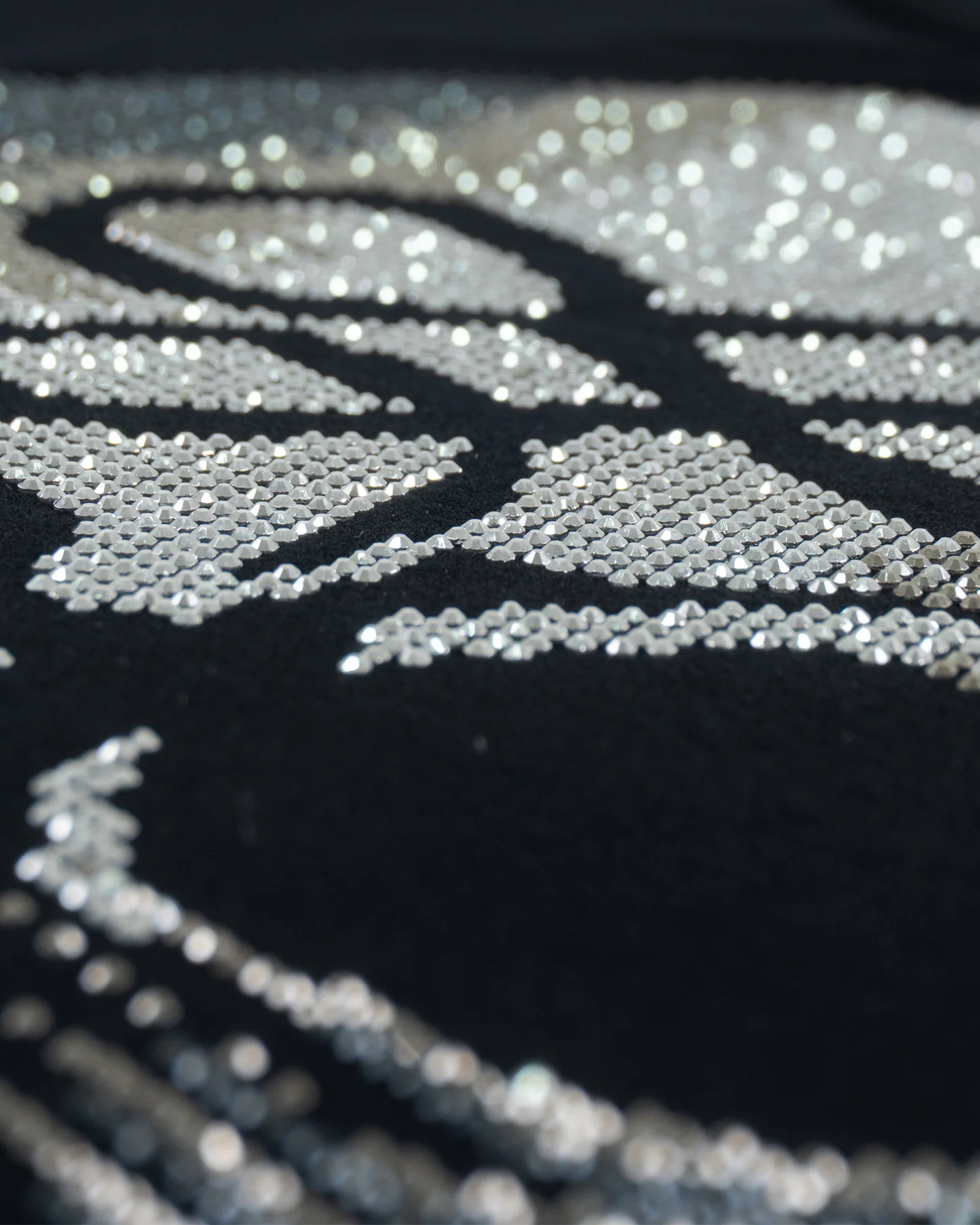 Calavera de brillo que desafía. El espíritu rebelde se borda en pedrería. Noche y actitud en un solo negro esencial.