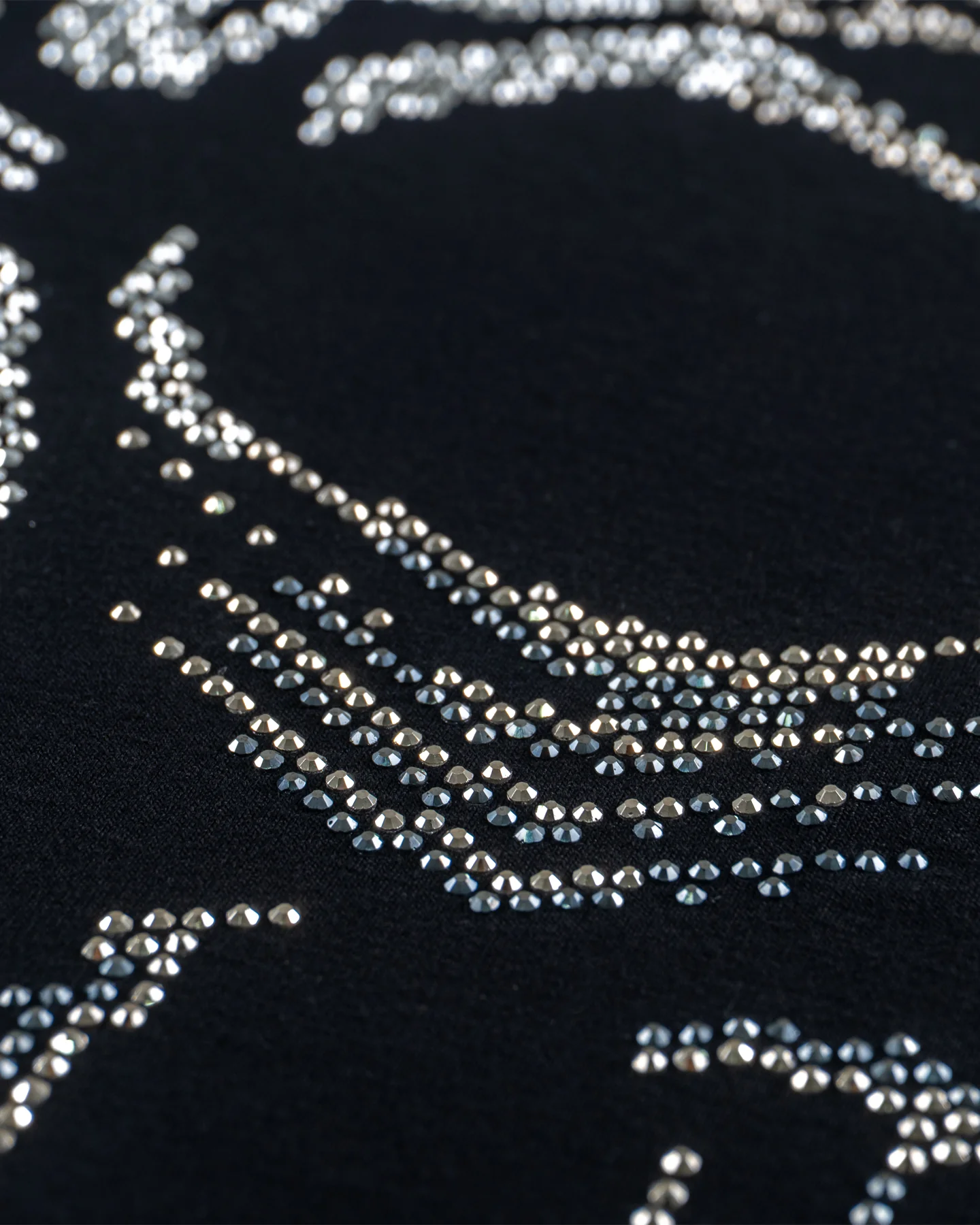 Calavera de brillo que desafía. El espíritu rebelde se borda en pedrería. Noche y actitud en un solo negro esencial.