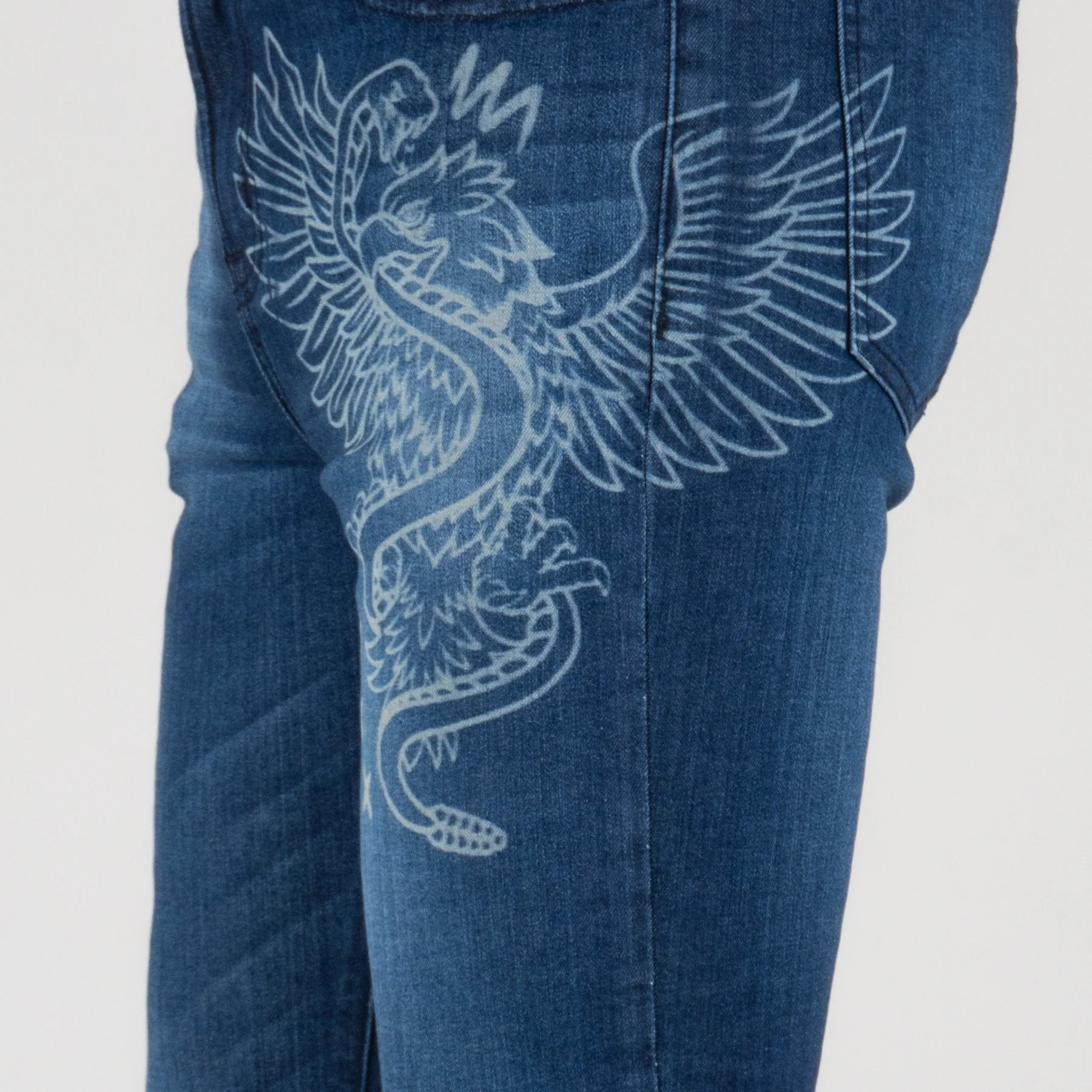 Jeans skinny para caballero con estilo audaz. Diseño moderno con grabado láser de águila en un costado. Corte ajustado para una silueta definida. ¡Añade un toque único a tu look!