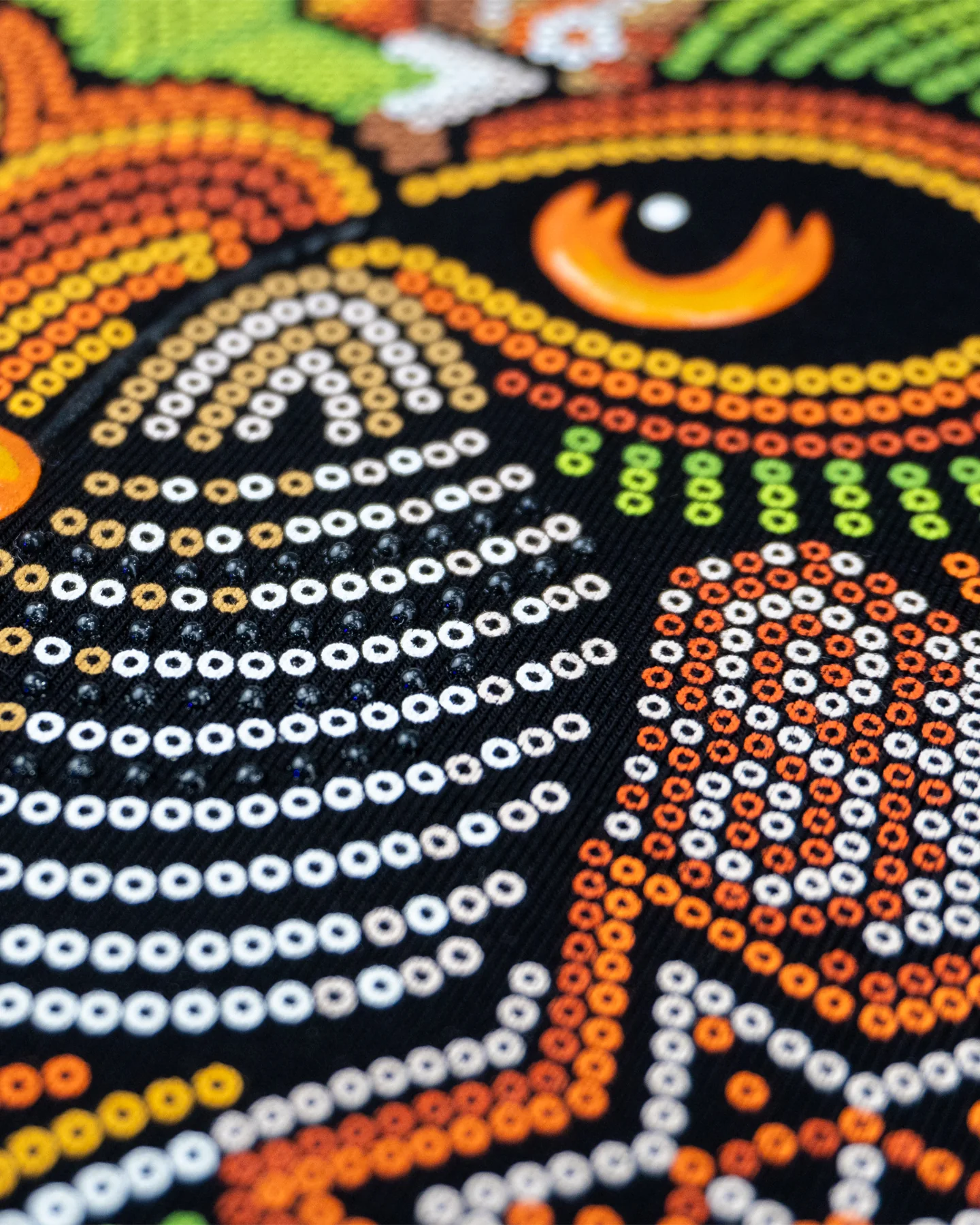 Esta pieza no es solo una camiseta; es un lienzo que porta la fuerza y la historia. Presenta un majestuoso jaguar, símbolo de poder prehispánico, cuyo rostro está intrincadamente elaborado con un patrón de "chaquiras" en tonos tierra, verde y rojo, reflejando las técnicas magistrales de Menchaca. El diseño se complementa con una imponente armadura dorada en el pecho que evoca la realeza ancestral.