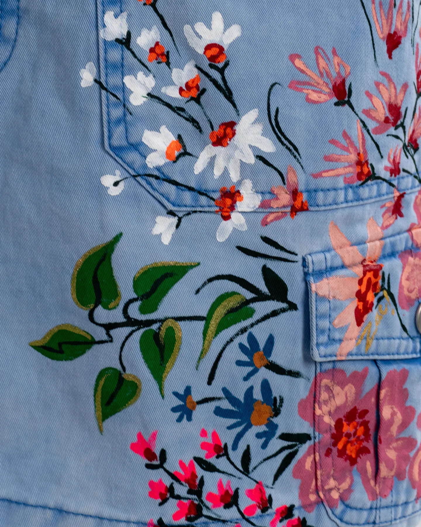 Descubre la exclusividad de nuestra falda "Picosita". Elaborada en mezclilla suave y embellecida con un detallado diseño floral pintado a mano. Un básico reinventado que aporta frescura y originalidad a tu look.