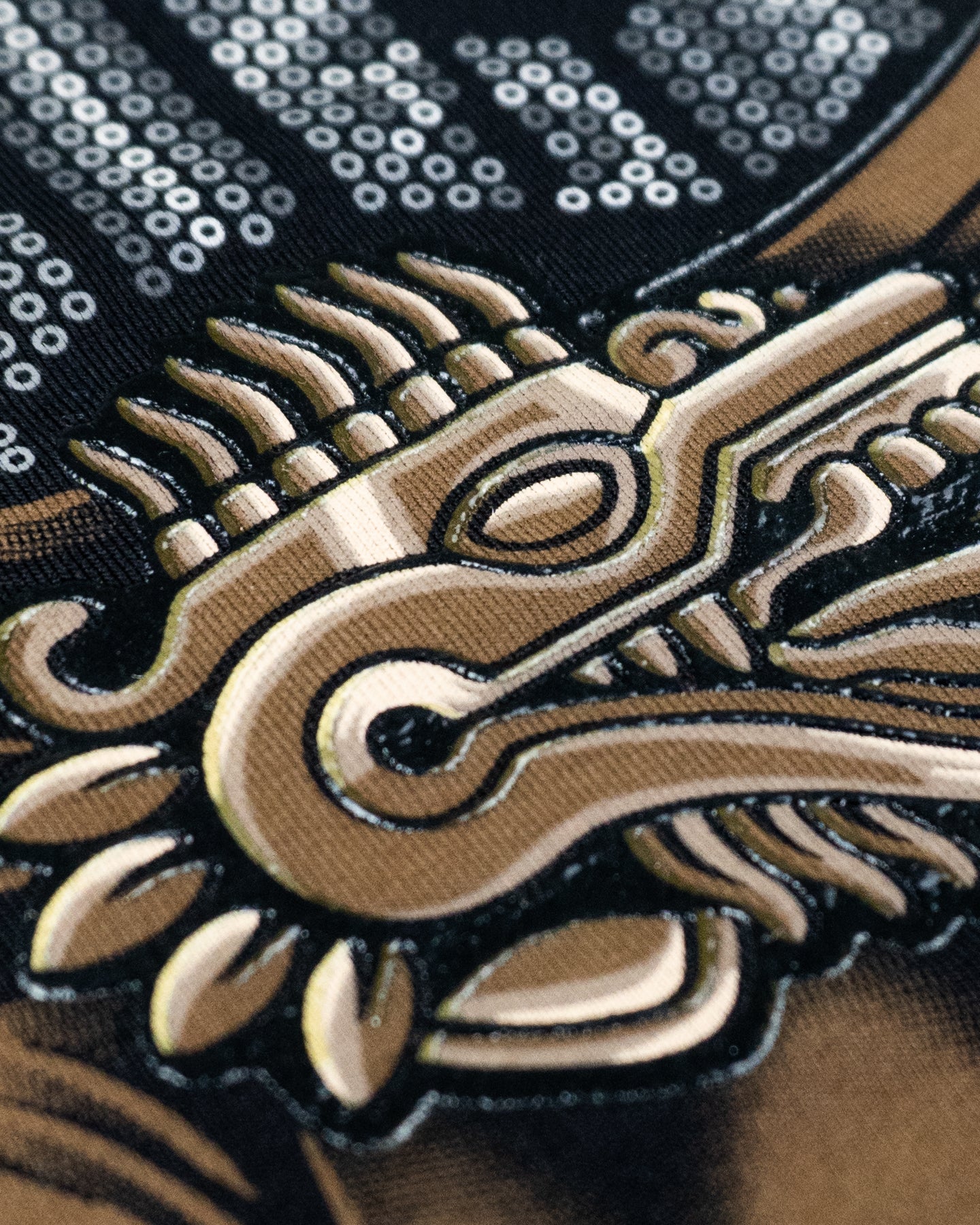 El diseño presenta a un guerrero de élite mexica en postura de combate. La figura está revestida por una armadura de patrones geométricos que reinterpretan el pelaje del jaguar mediante la estética del enchaquirado. En sus manos porta las armas de rango: el macuahuitl (espada de madera con filos de obsidiana) y el chimalli (escudo), este último ornamentado con la faz de una deidad solar, simbolizando protección y linaje.