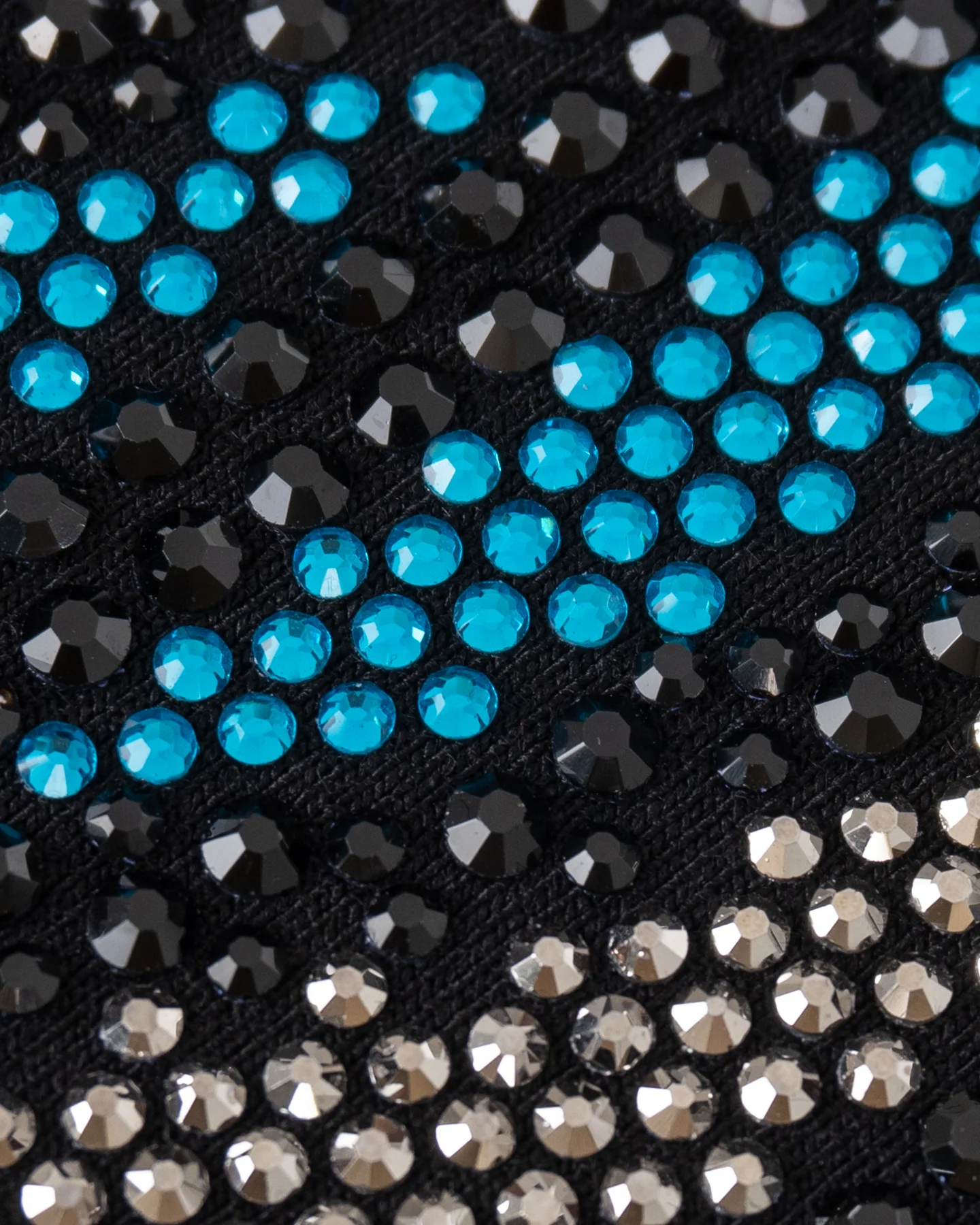 Corte regular en tono negro, pespunte reforzado en el dobladillo. Destaca un diseño central inspirado en el muralista mexicano, elaborado con aplicaciones de pedrería en contraste cian y plata.