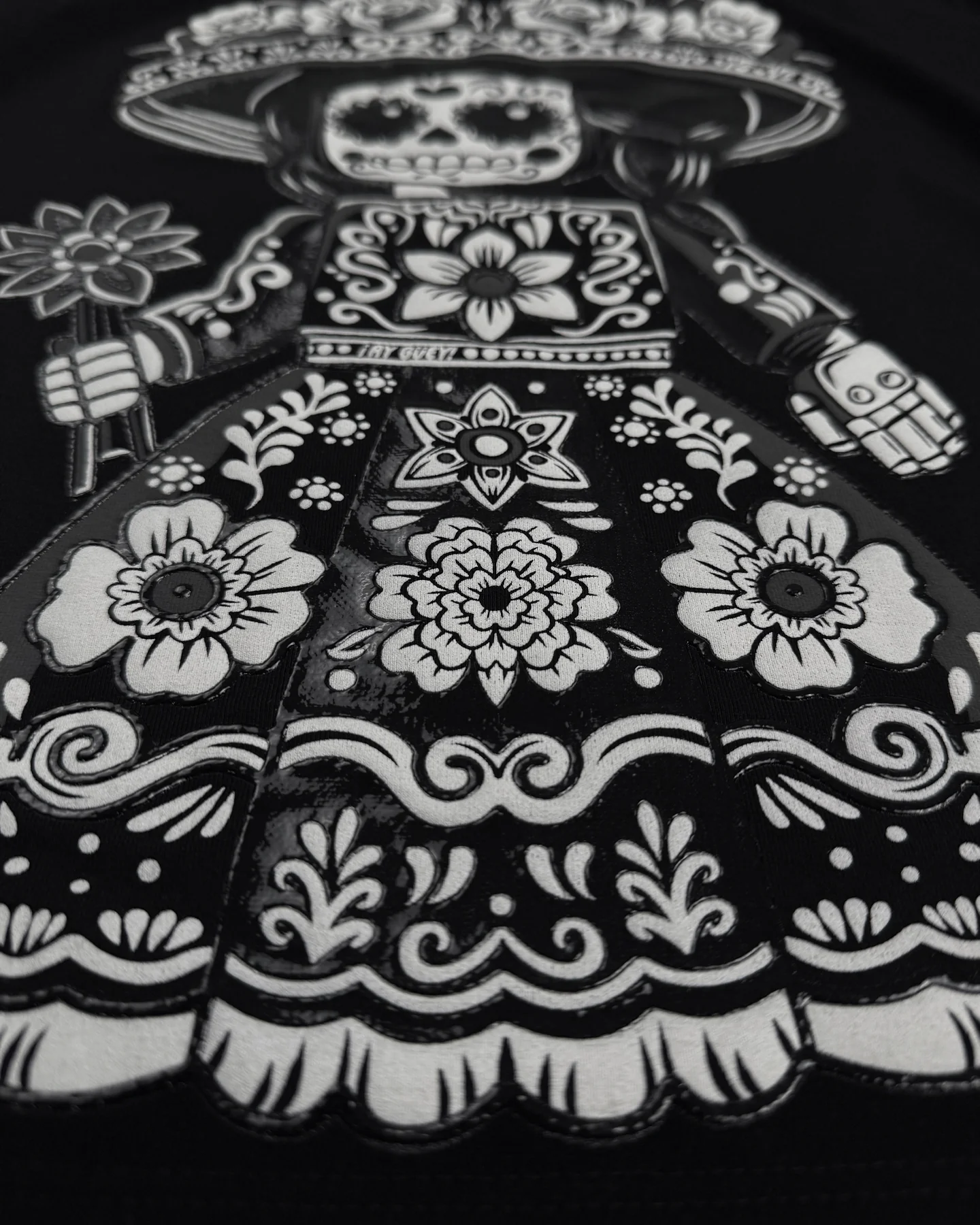 ¡Celebra el Día de Muertos! Nuestra playera "Robotina" es la Catrina mexicana reinterpretada, un vibrante homenaje a la familia y la vida.