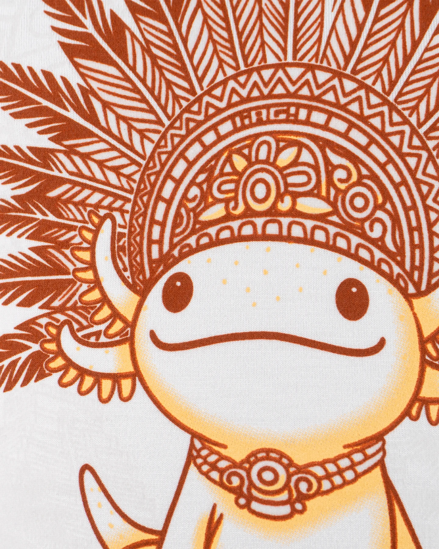 Esta playera nace de la fusión entre la fauna endémica mexicana y la herencia prehispánica. El ajolote, símbolo de regeneración y sabiduría ancestral, es representado aquí con un penacho ceremonial que evoca la grandeza de las culturas mexica y maya. Su gesto tierno y sereno recuerda que el poder no siempre viene del rugido, sino también de la calma.