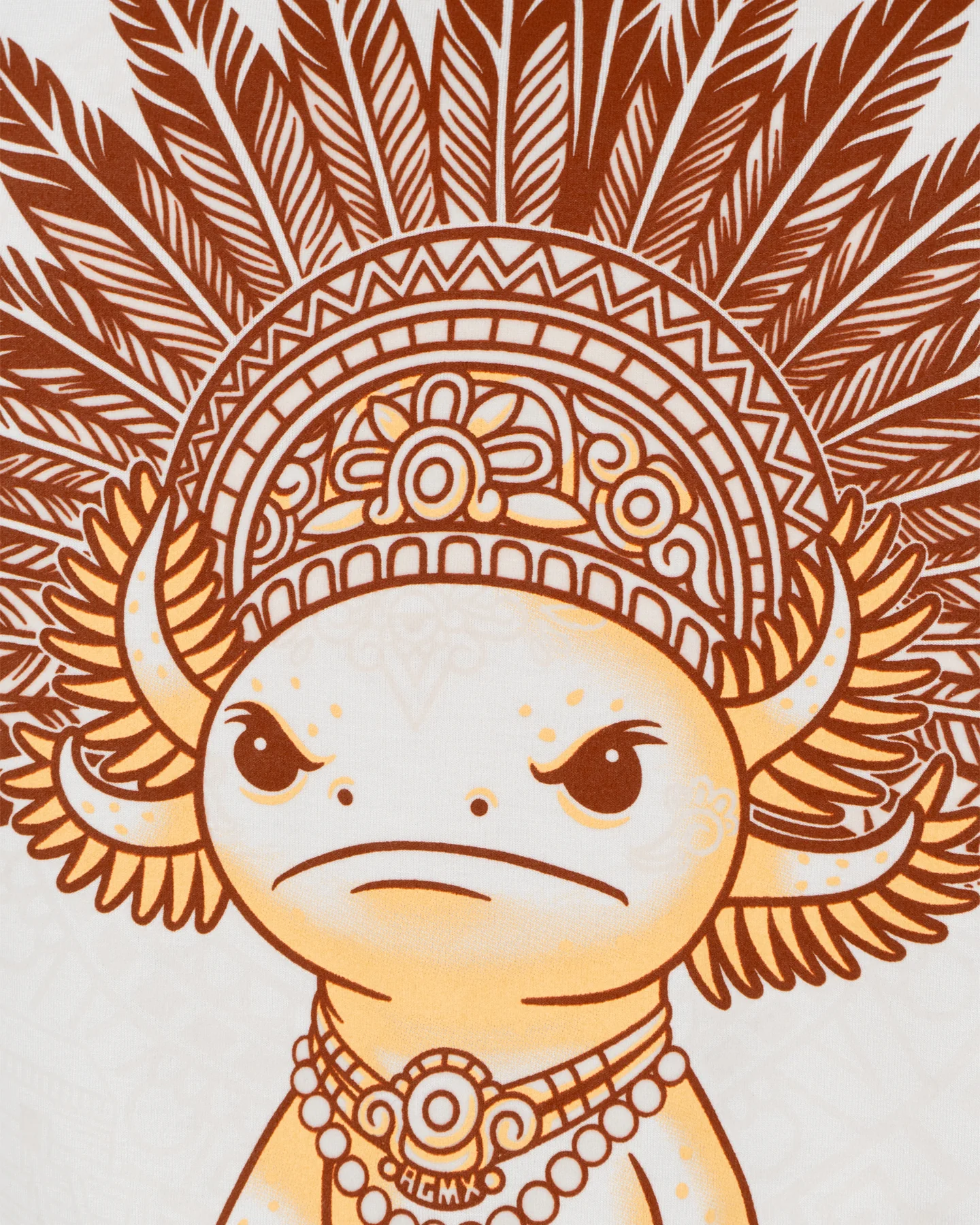 Esta playera nace de la fusión entre la fauna endémica mexicana y la herencia prehispánica. El ajolote, símbolo de regeneración y sabiduría ancestral, es representado aquí con un penacho ceremonial que evoca la grandeza de las culturas mexica y maya. Su gesto tierno y sereno recuerda que el poder no siempre viene del rugido, sino también de la calma.