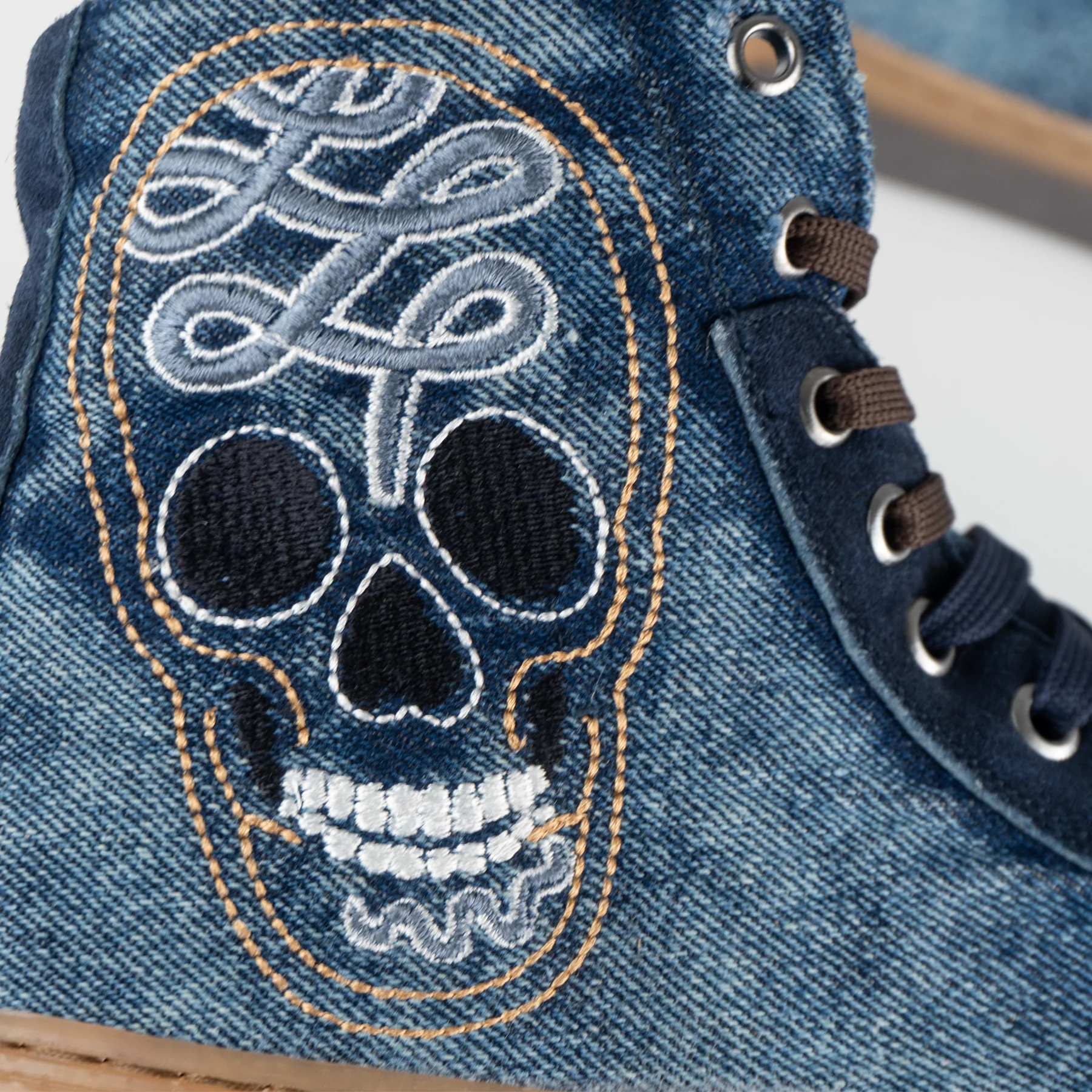 Descubre la fusión perfecta entre tradición y tendencia con nuestros tenis de bota. La mezclilla y la suela de liga se unen en un diseño audaz, adornado con calaveras de azúcar bordadas que rinden homenaje a nuestras raíces mexicanas. Un calzado que combina comodidad y estilo, hecho para los espíritus libres.