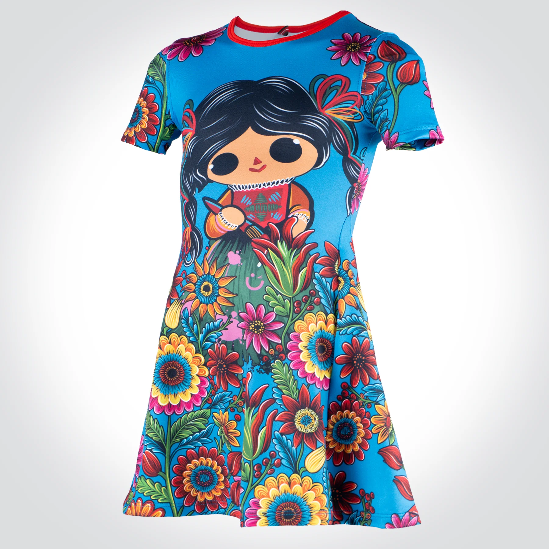 Vestido para niña sublimado inspirado en el colorido de las flores del campo, al frente se encuentra "Petrita", nuestra reinterpretación de la muñeca mazahua.
